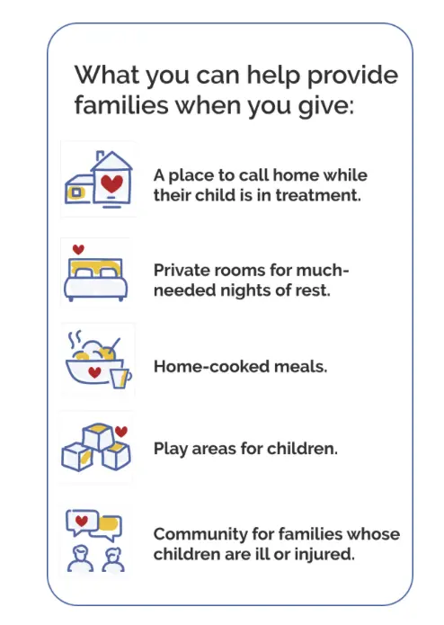 Compassionate friends like you ensure children are close to the care they need and even closer to the family that loves them when they are ill or injured. Your tax-deductible gift today will provide a home away from home, care and comfort for families.